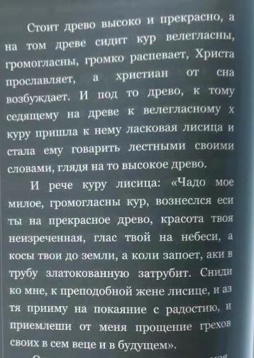 有一顆高高的大樹,枝繁葉茂,樹干挺直;這棵樹上棲息著一只公雞,它聲音洪亮,大聲啼叫,歌頌基督,把基督徒從睡夢中喚醒。一只看上去溫文爾雅的狐貍來到大樹下面,她來見那只棲在樹上的大聲啼叫的公雞。狐貍兩眼望著那高高的大樹,開始對公雞阿諛奉承。